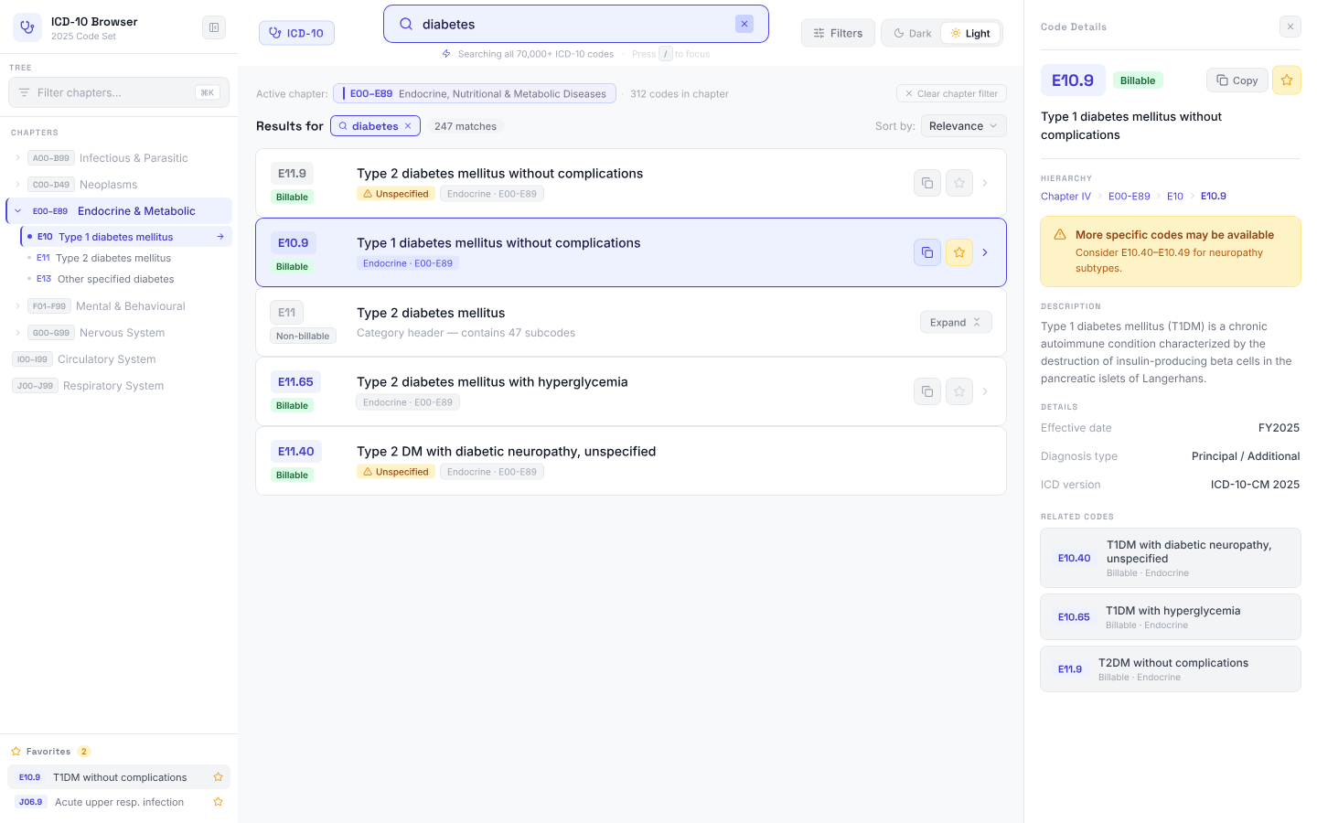 Search through 70,000+ ICD-10 codes in milliseconds. Find what you need before you finish typing.